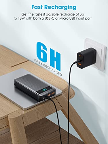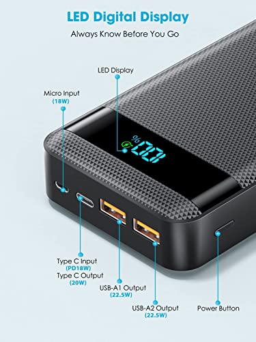 【Power Bank Fast Charging】The mobile phone portable power banks with total 4 charging ports of 2 USB-A QC3.0 22.5W output and 1 USB-C PD 20W output and 18W input support bidirectional quick speed charge, which only takes 30 mins to charge for iPhone 12 up to 60% and charge for Samsung S20 up to 65% by the original mobile phone charging cable, besides, fully recharge the mobile phone portable charger power bank only need 6.5 hours, which will help you save more time.