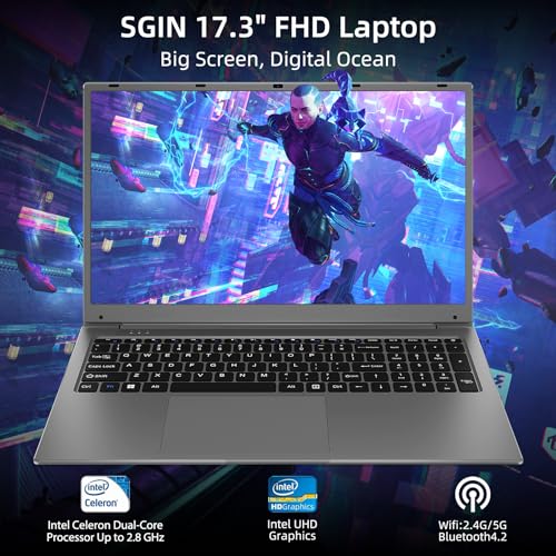 Specification: SGIN 17.3 Inch Laptop 8GB DDR4 512GB SSD (TF 512GB), Celeron Dual-Core Processor(Up to 2.8GHz), 2xUSB 3.0, Dual Band WiFi, Bluetooth 4.2, FHD 1920×1080 Notebook Ships with Keyboard Film in 8 Languages